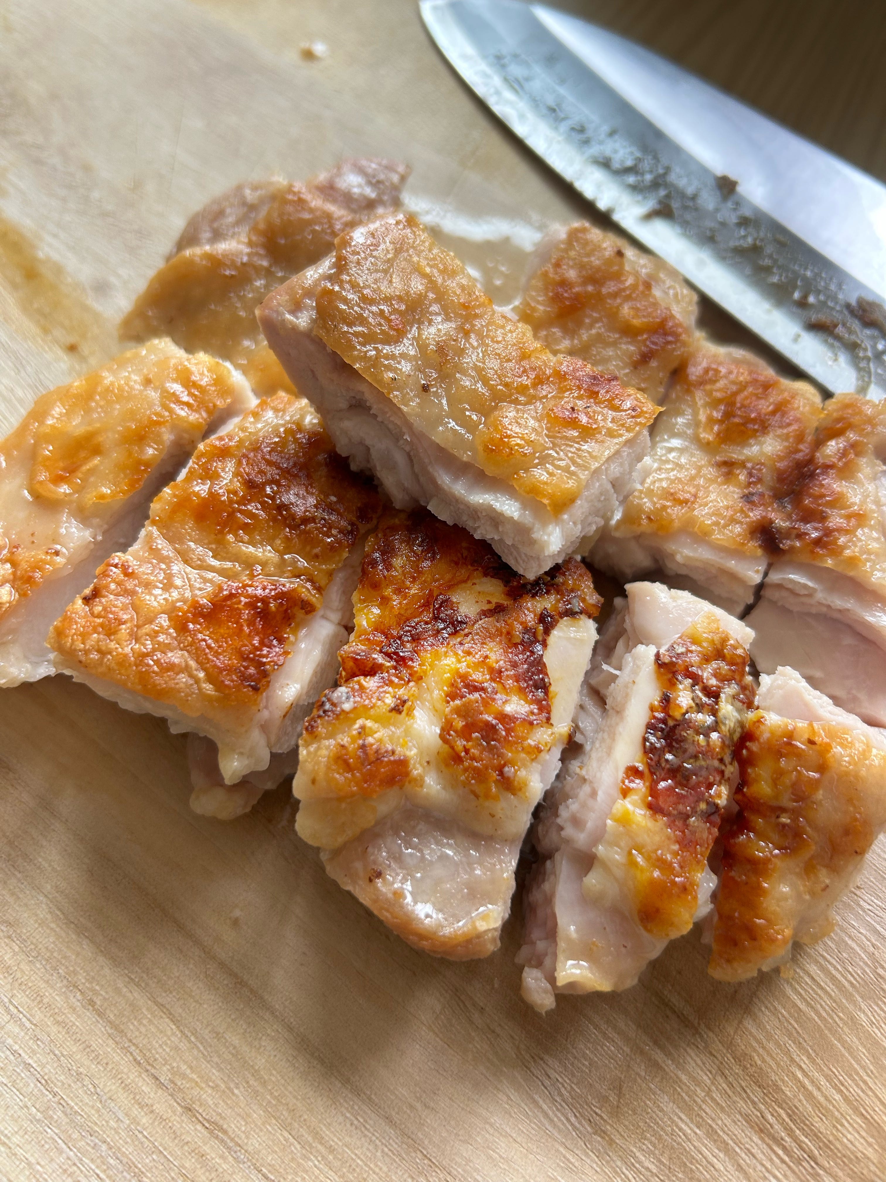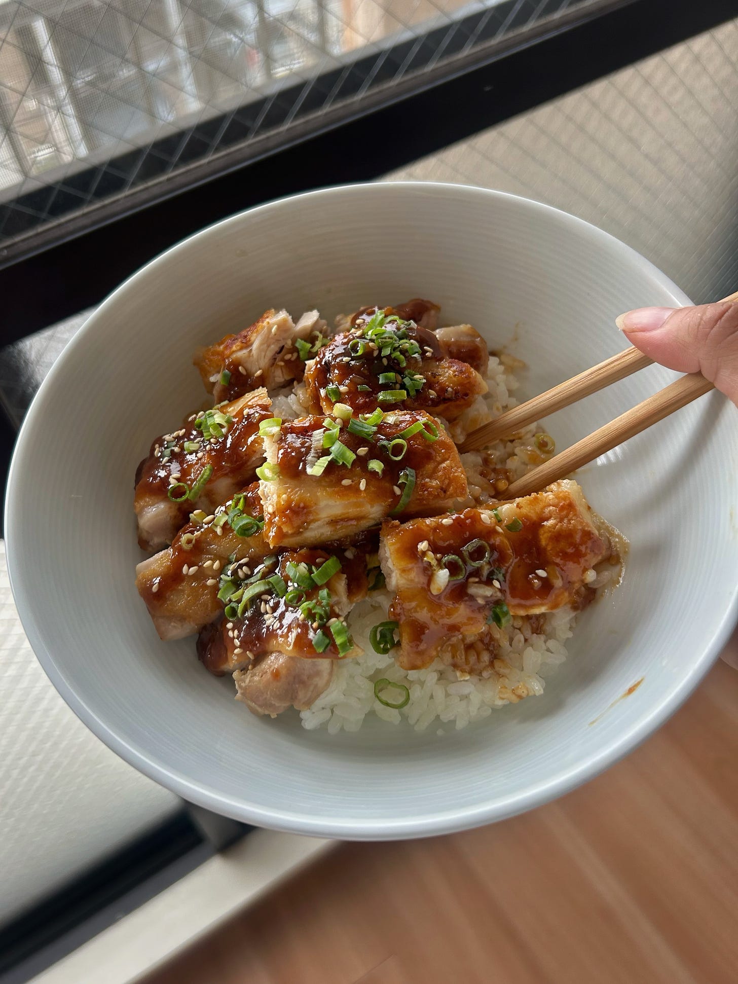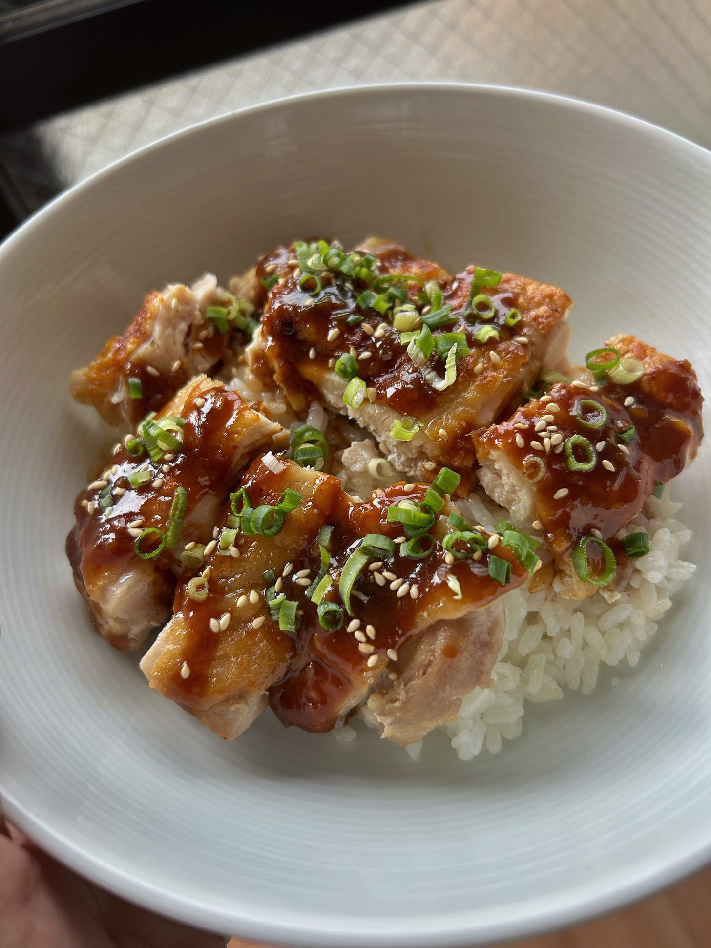 8. Cut your chicken thigh into strips or bite sized pieces. Add your rice to a rice bowl and place the cut chicken pieces on top.