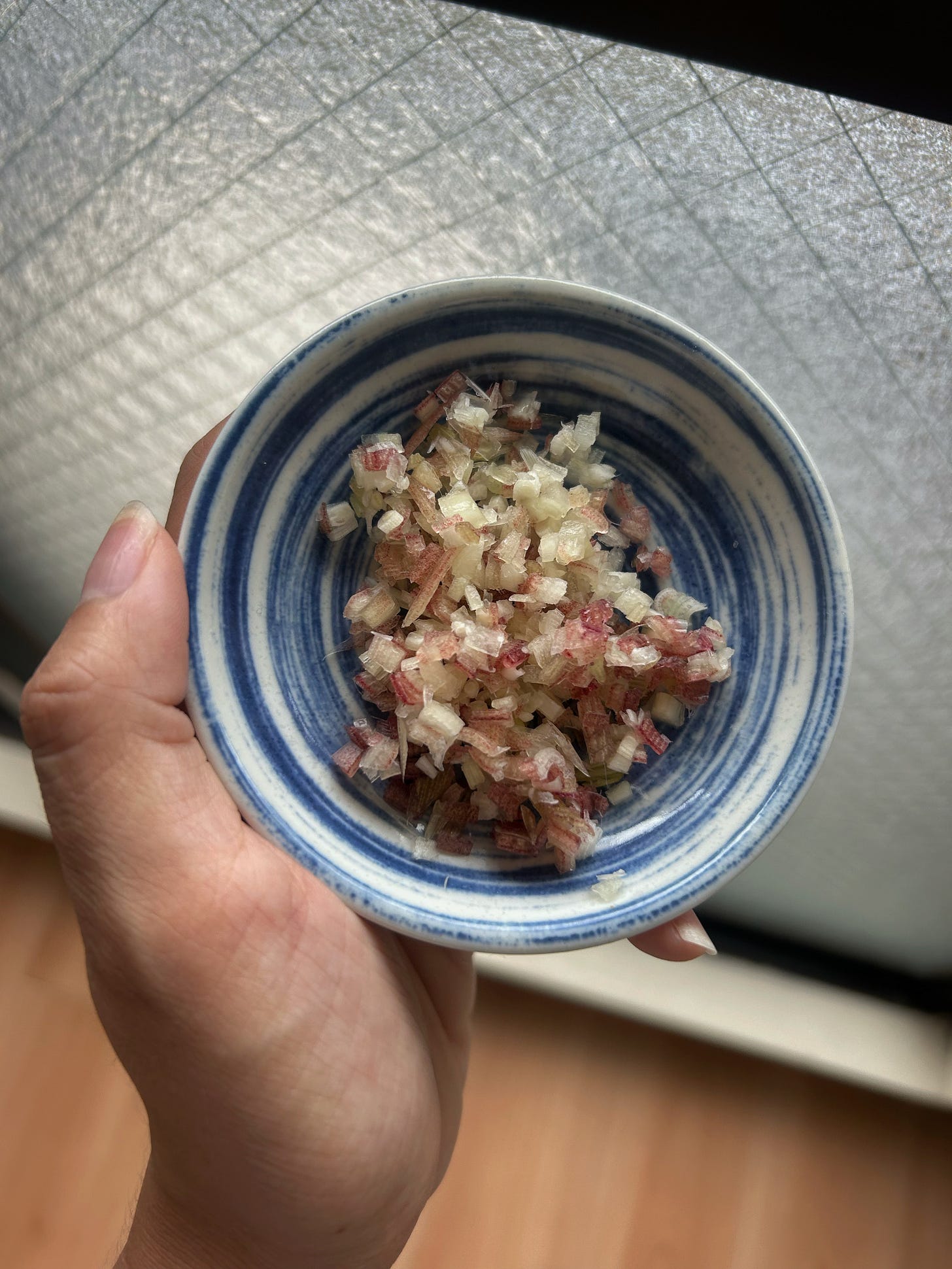 6. In the same pan, turn your heat to medium low and add your minced myoga. Sauté until fragrant, about 1 minute. Add a splash of sake and deglaze your pan.