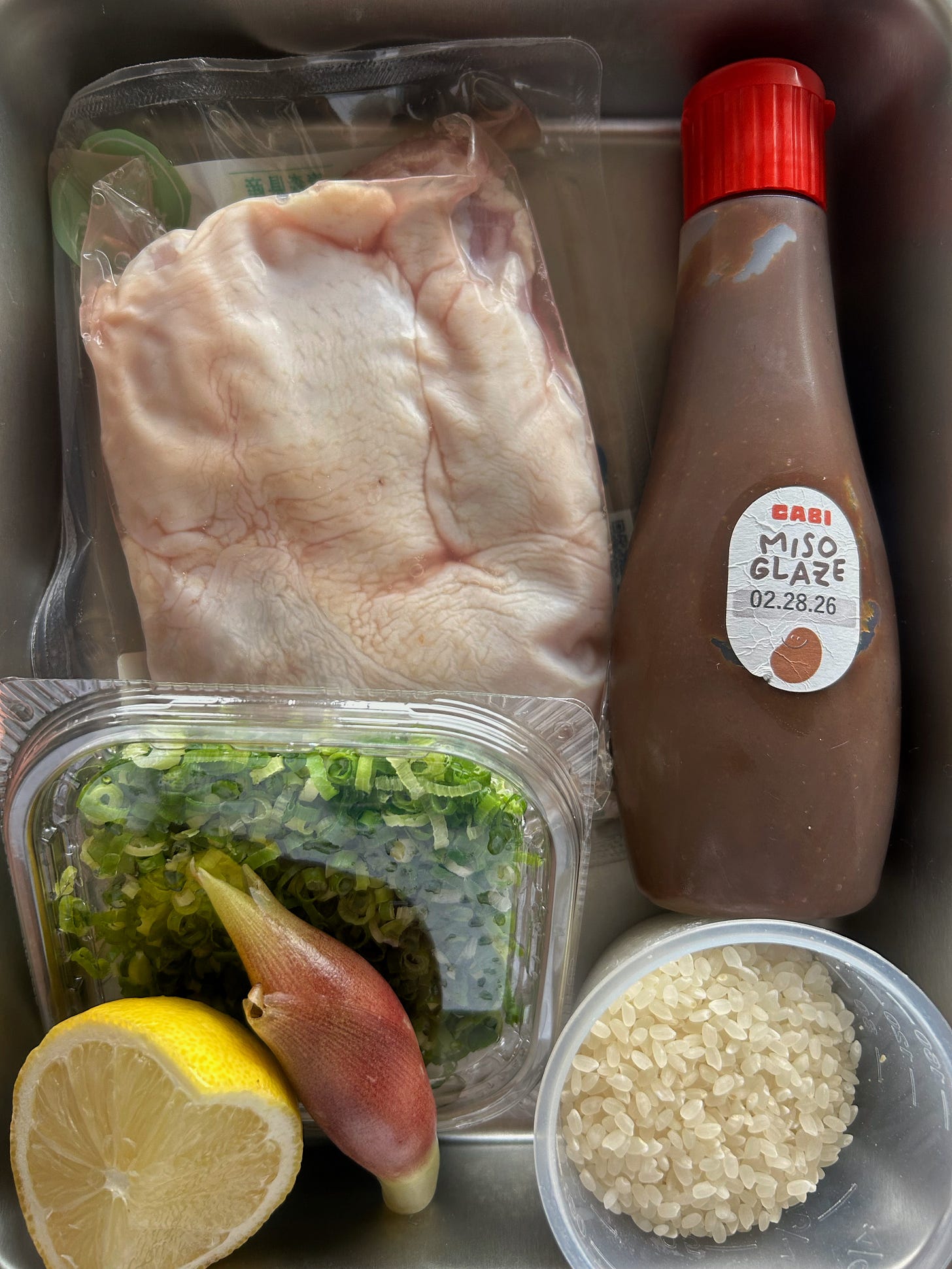 This chicken and rice then would be called a “donburi”, which you might often see as the suffix “don” (think oyakodon or katsudon). A donburi describes a rice bowl dish typically consisting of fish, meat, or vegetables served over a bed of hot white rice. It’s a quintessential part of Japanese home cooking and one that’s hearty, comforting and especially convenient for mid-week meals. This is a slightly elevated version but still really simple, made with crispy chicken, its fat slowly rendered in the pan, and a sweet, citrusy and umami rich sauce made with Cabi’s Miso Glaze.